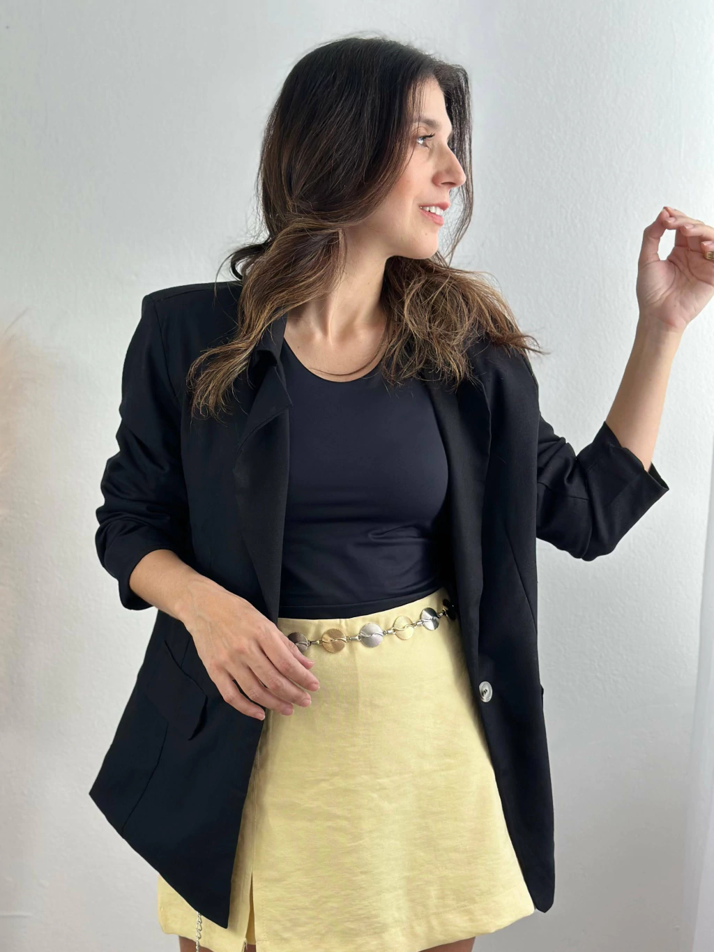 A modelo das fotos veste 36|38, pesa 50kg e tem a altura de 1,55m, ela veste o tamanho P do blazer.