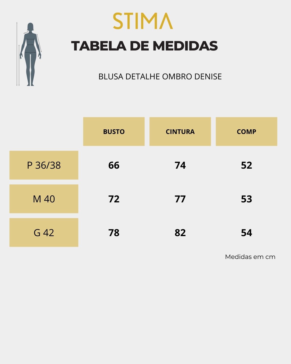 ACABAMENTO: Ombro caído, detalhe metálico, detalhe de elástico, podendo usar o ombro de duas formas.