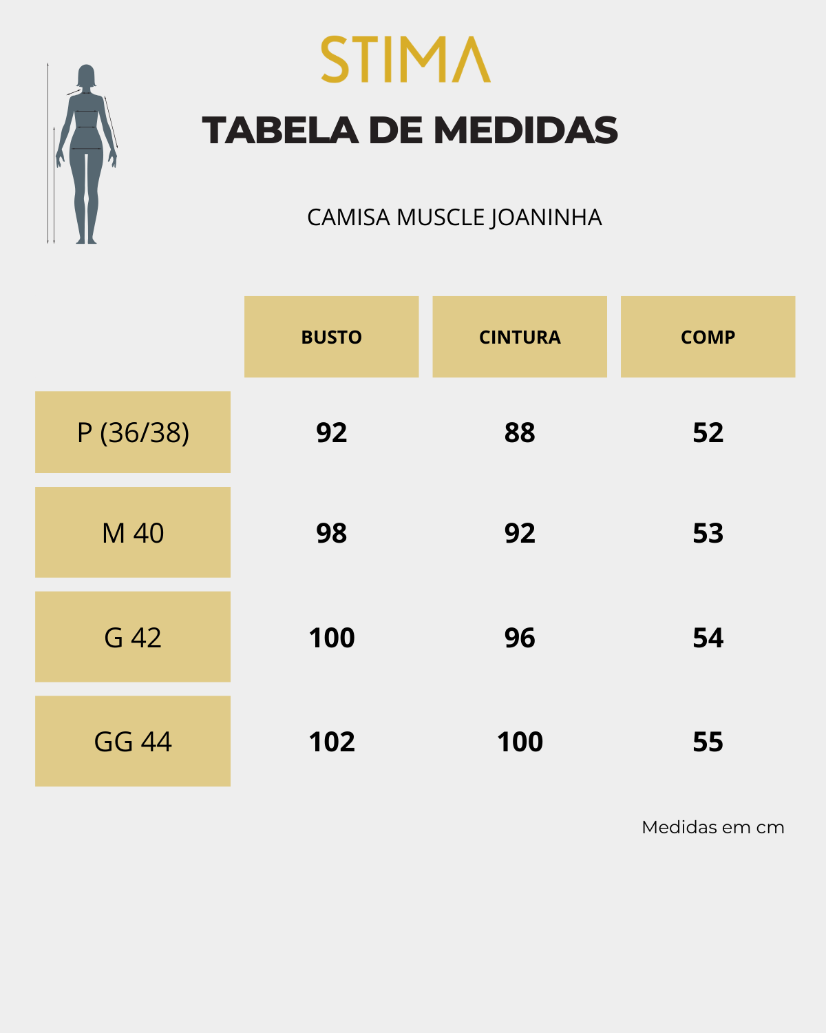A modelo das fotos veste 36|38, pesa 50kg e tem a altura de 1,55m, ela veste o tamanho P da camisa.