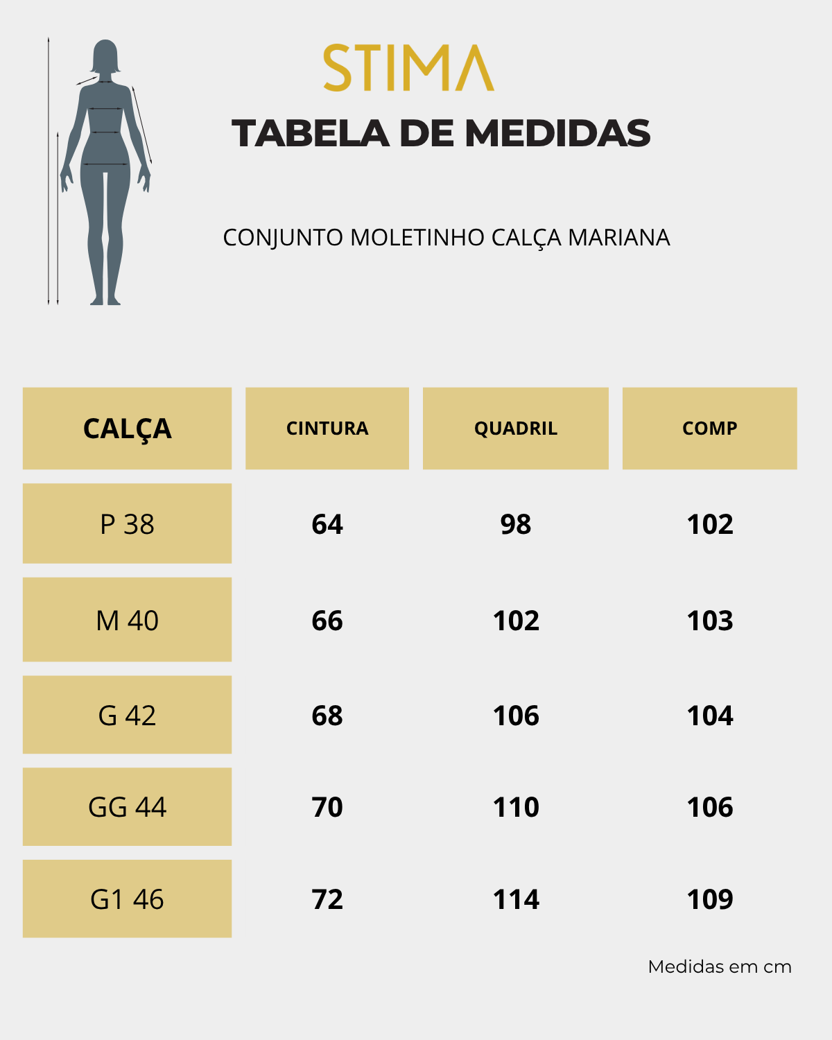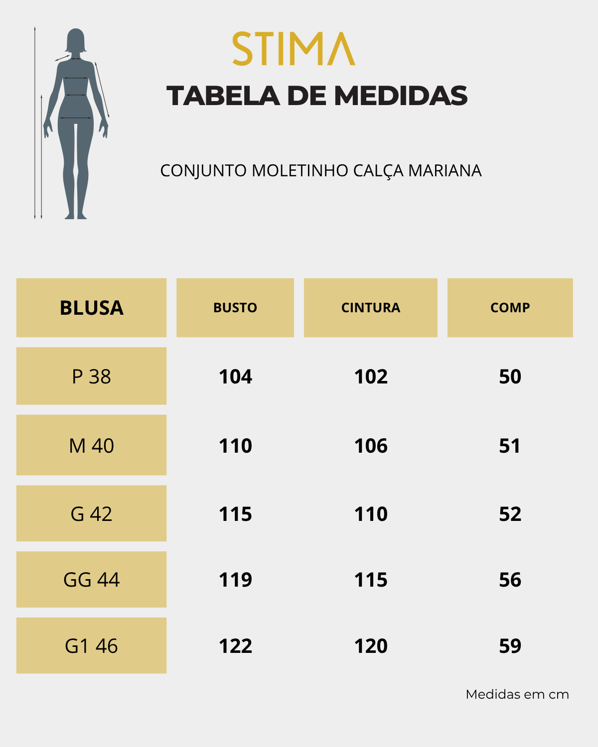A modelo das fotos veste 36|38, pesa 50kg e tem a altura de 1,55m, ela veste o tamanho P do conjunto.