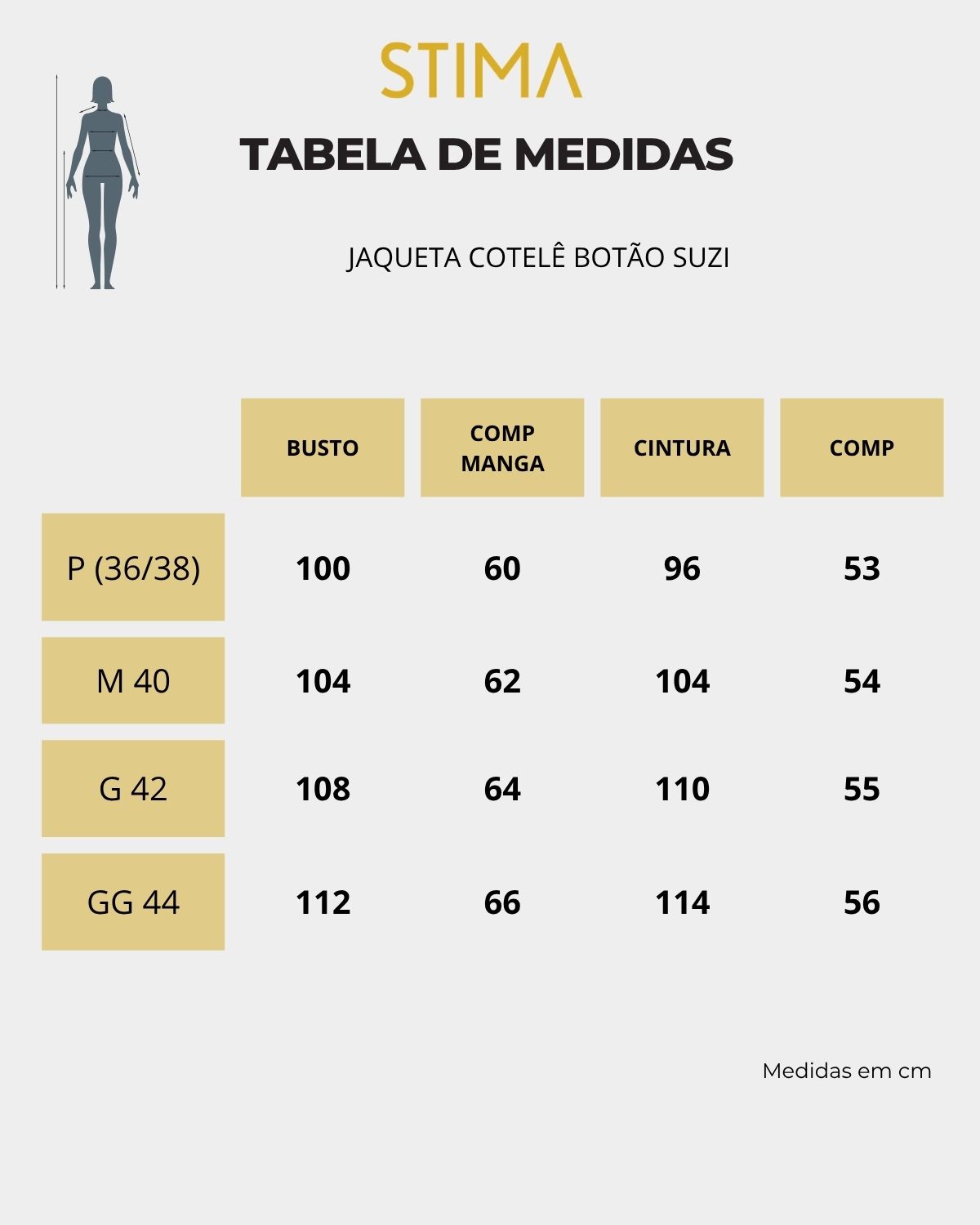 A modelo das fotos veste 36|38, pesa 50kg e tem a altura de 1,55m, ela veste o tamanho P da jaqueta.