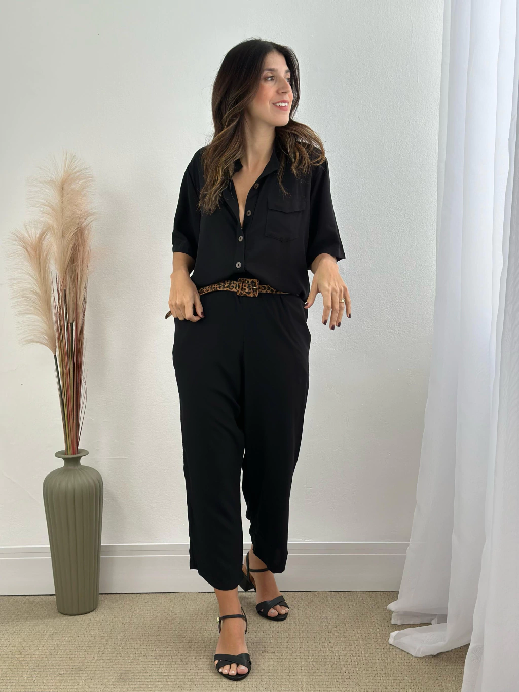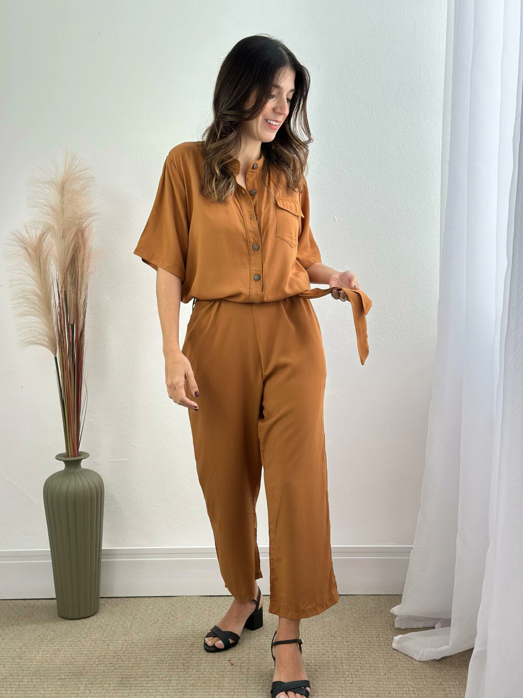 A modelo das fotos veste 36|38, pesa 50kg e tem a altura de 1,55m, ela veste o tamanho P do macacão.
