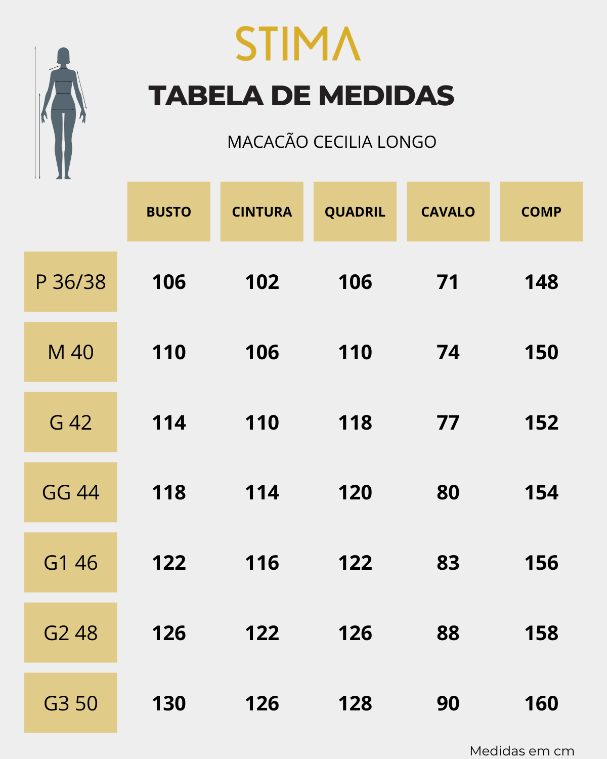 A modelo das fotos veste 36|38, pesa 50kg e tem a altura de 1,55m, ela veste o tamanho P do macacão.
