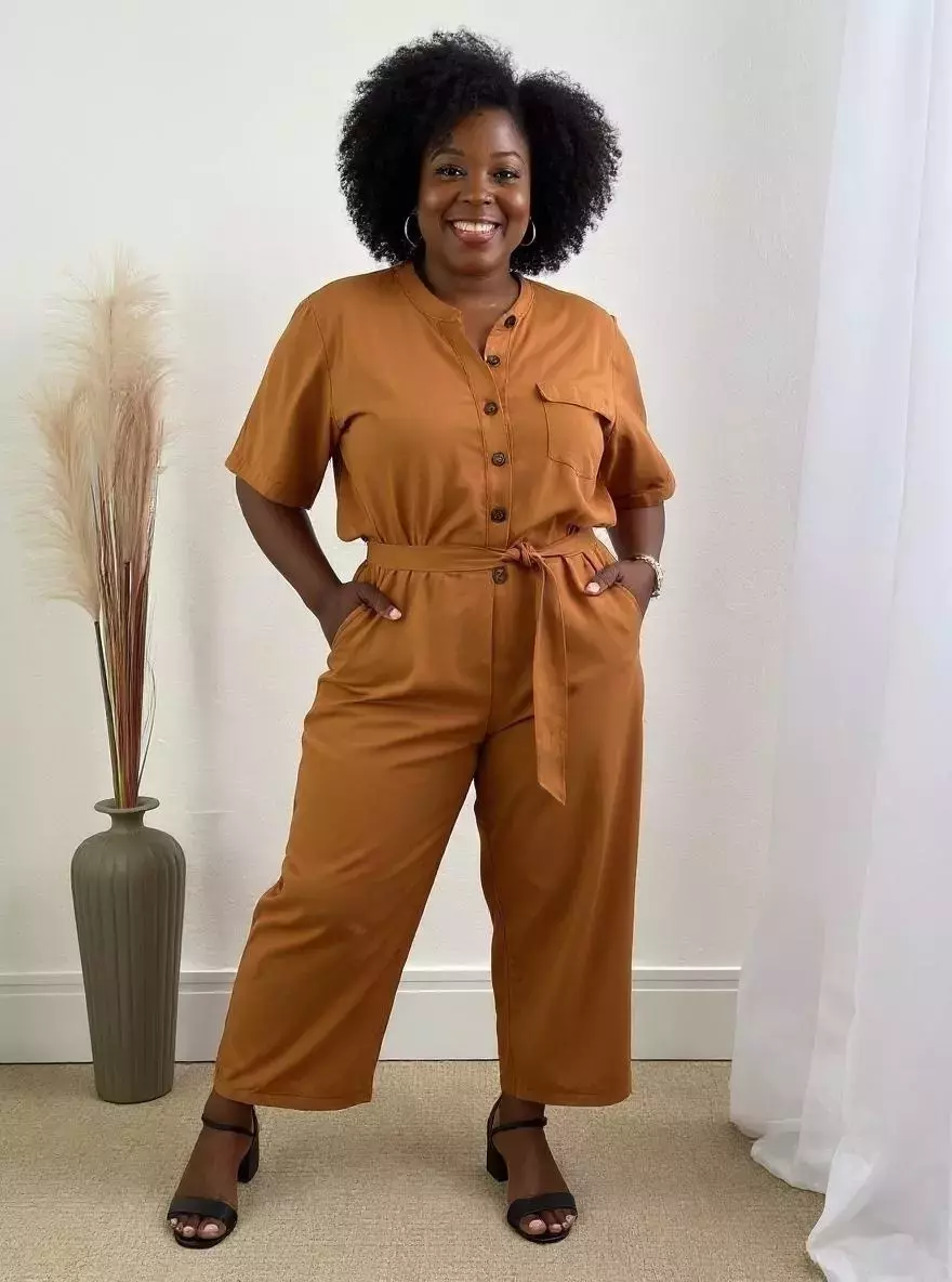 A modelo das fotos veste 36|38, pesa 50kg e tem a altura de 1,55m, ela veste o tamanho P do macacão.