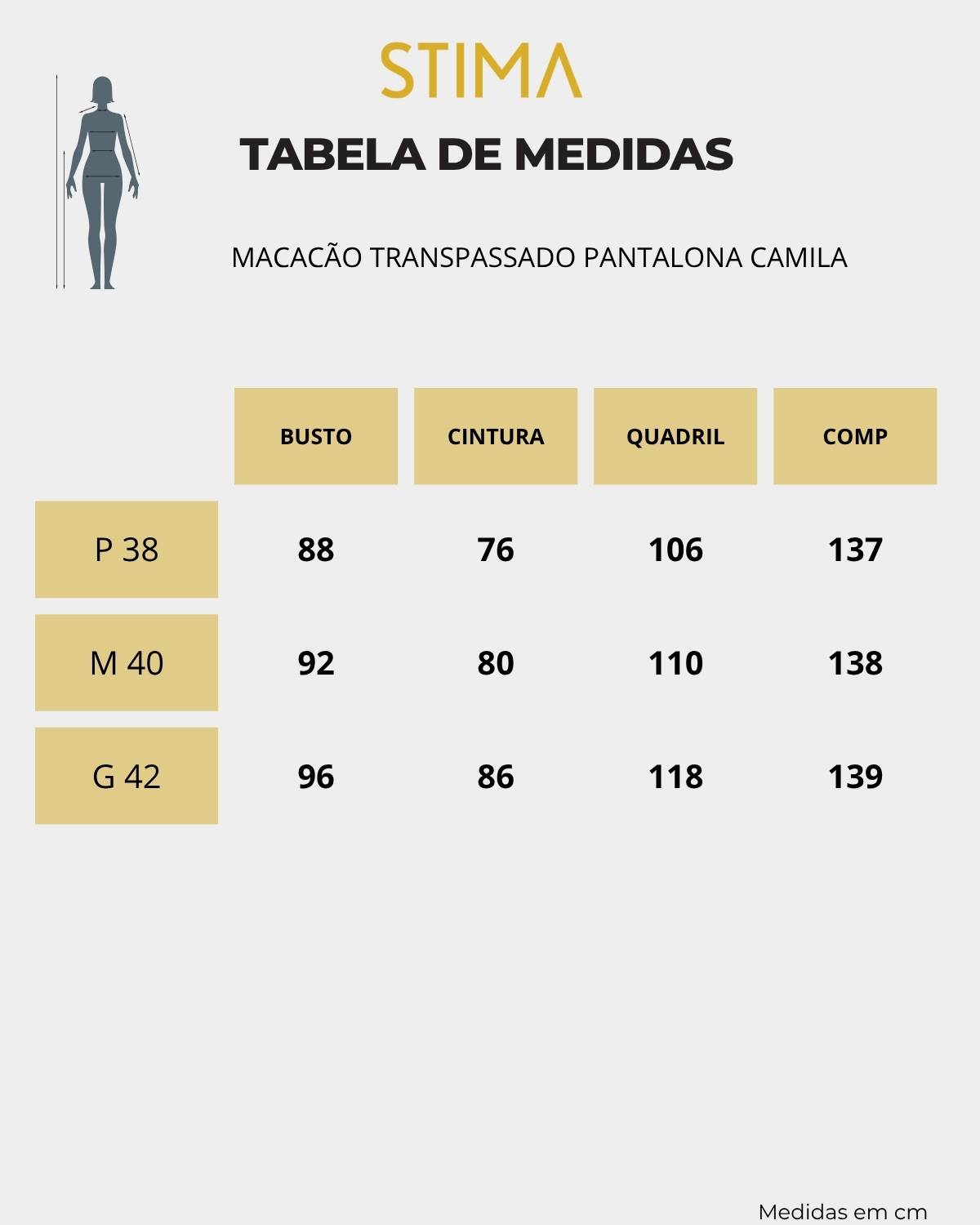 A modelo das fotos veste 36|38, pesa 50kg e tem a altura de 1,55m, ela veste o tamanho P do macacão.