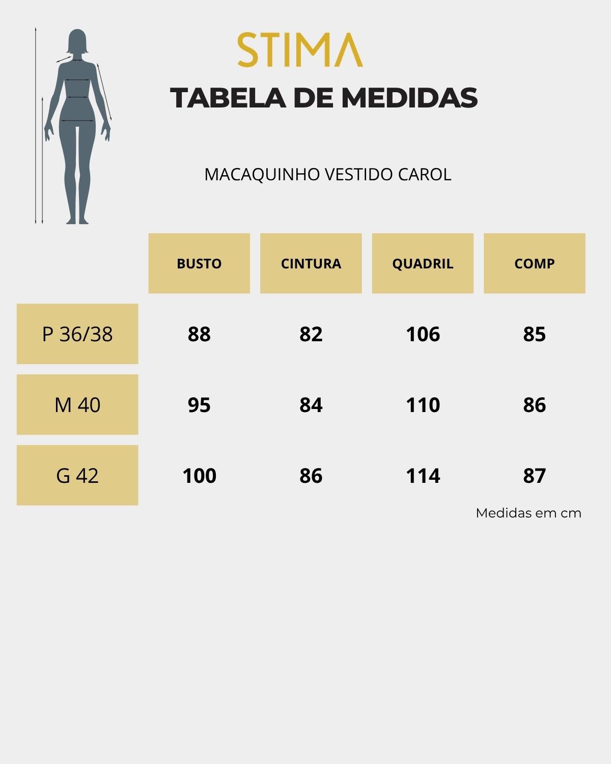 A modelo das fotos veste 36|38, pesa 50kg e tem a altura de 1,55m, ela veste o tamanho P do macaquinho vestido.