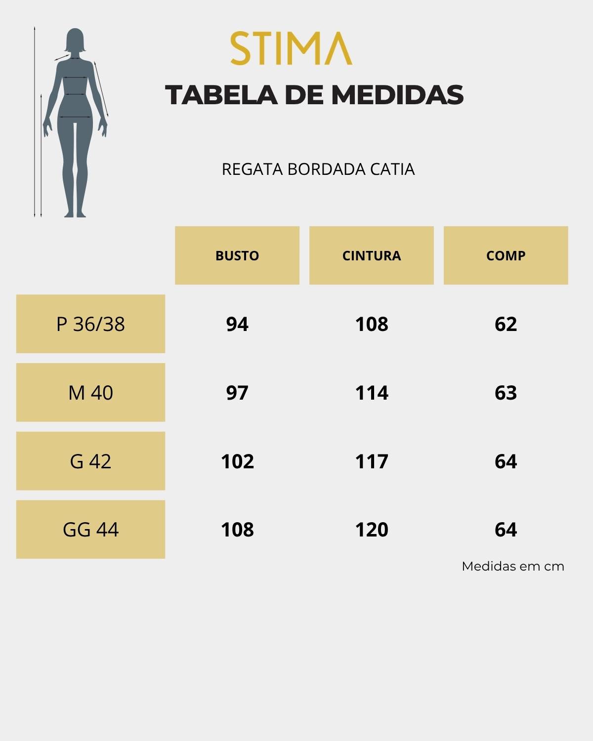 A modelo das fotos veste 36|38, pesa 50kg e tem a altura de 1,55m, ela veste o tamanho P da regata.