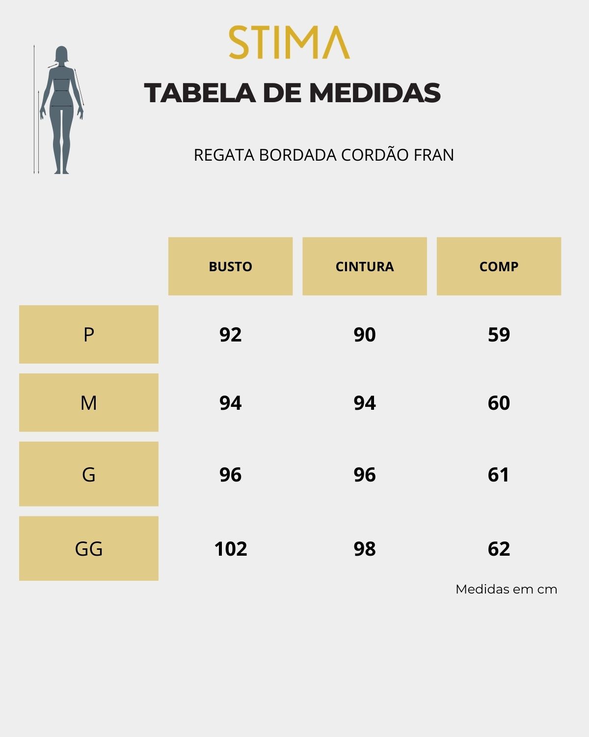 A modelo das fotos veste 36|38, pesa 50kg e tem a altura de 1,55m, ela veste tamanho P da regata.