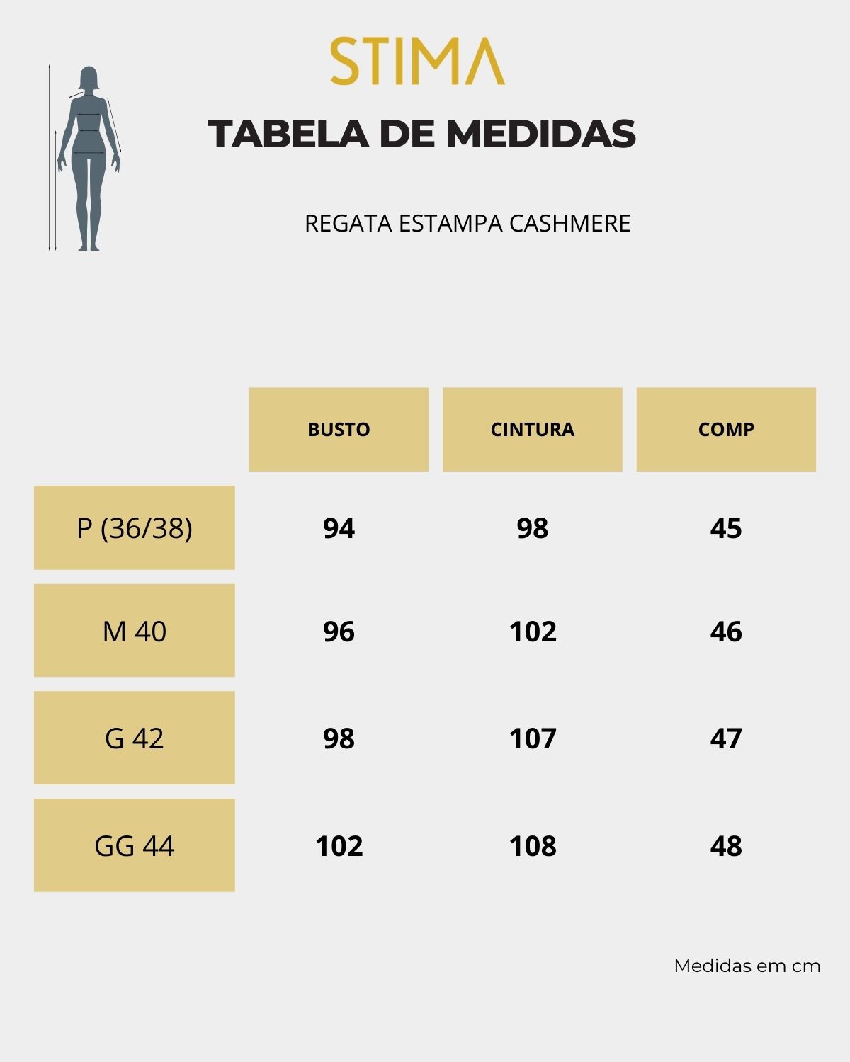 A modelo das fotos veste 36|38, pesa 50kg e tem a altura de 1,55m, ela veste o tamanho P da regata.
