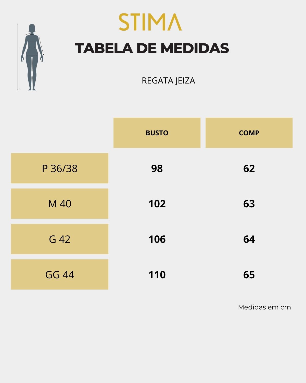 A modelo das fotos veste 36|38, pesa 50kg e tem a altura de 1,55m, ela veste o tamanho P da regata.