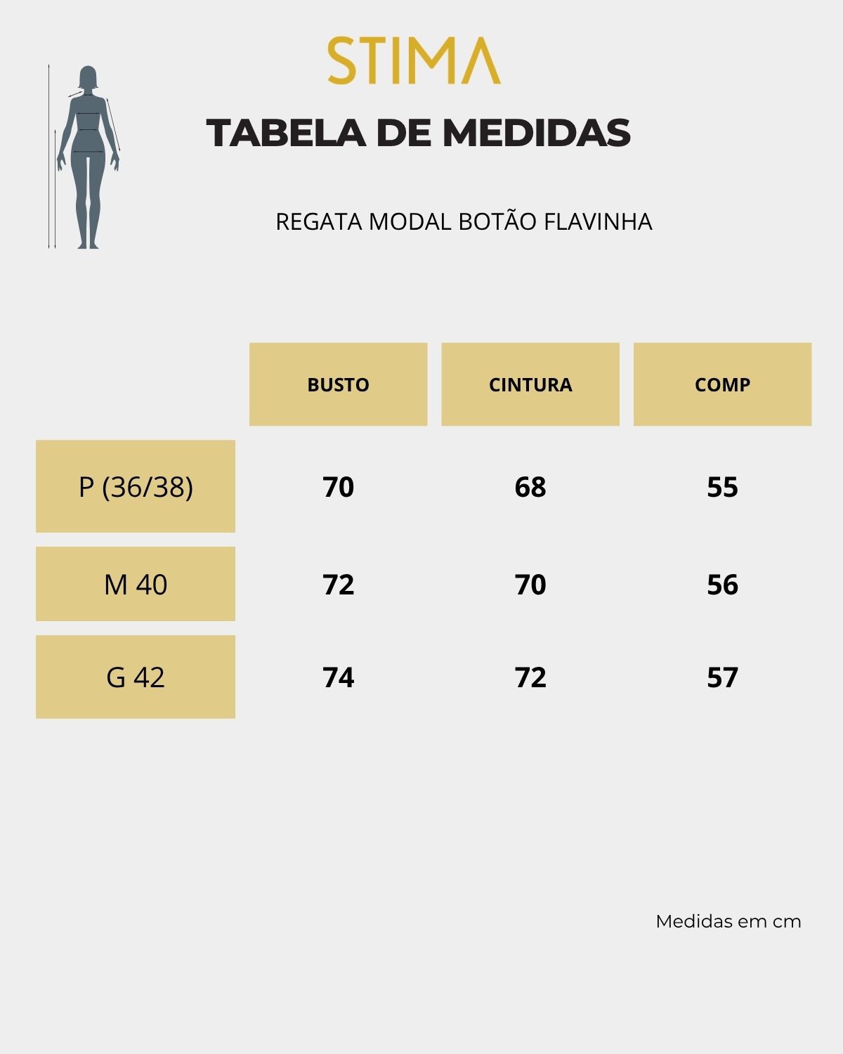 A modelo das fotos veste 36|38, pesa 50kg e tem a altura de 1,55m, ela veste o tamanho P da regata.