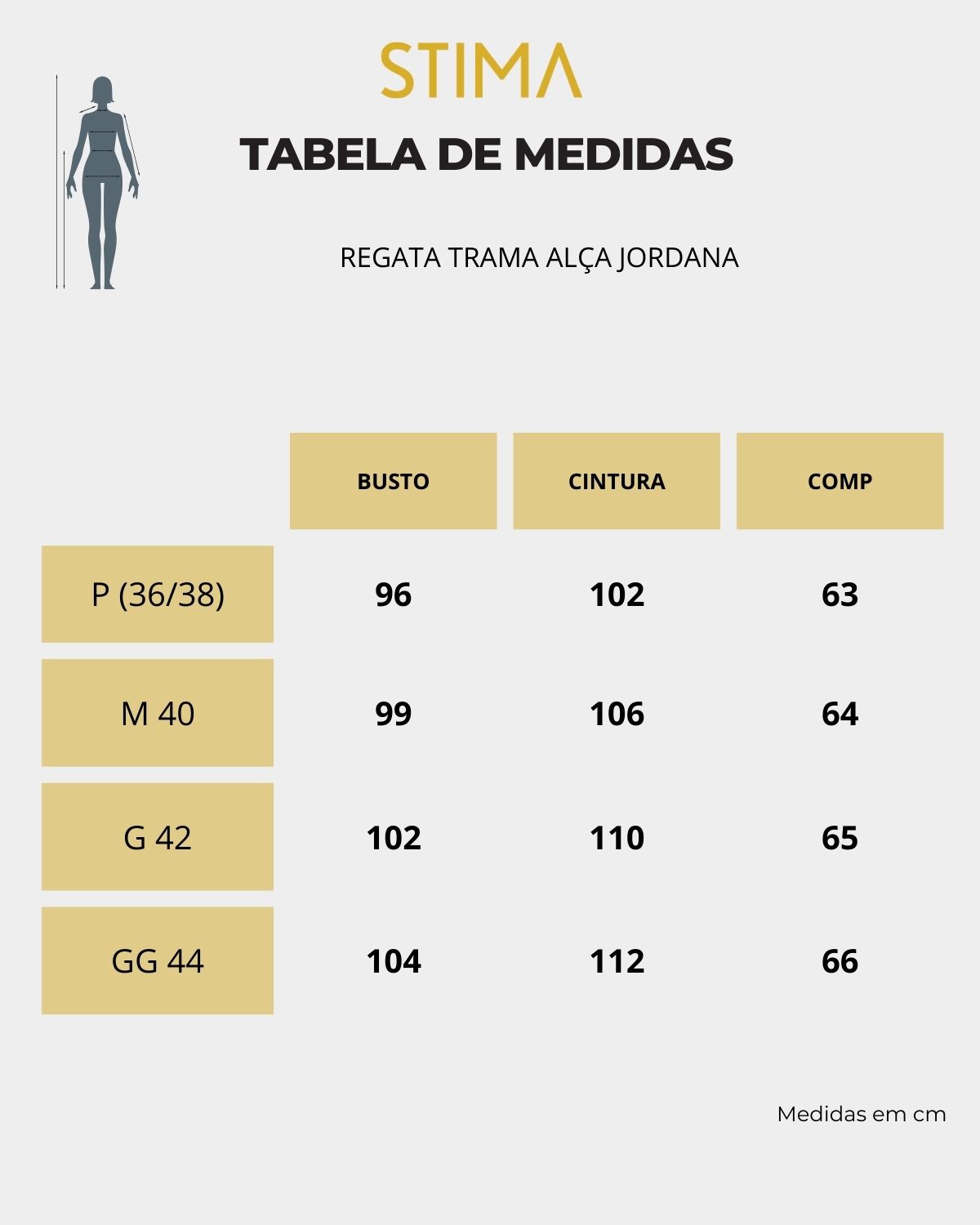 A modelo das fotos veste 36|38, pesa 50kg e tem a altura de 1,55m, ela veste o tamanho P da regata.