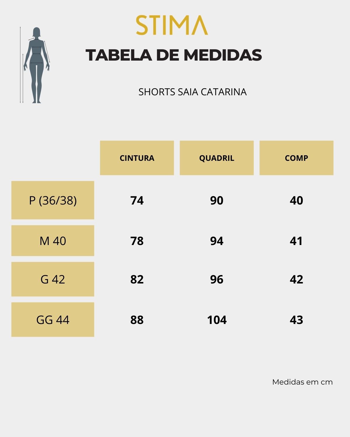 A modelo das fotos veste 36|38, pesa 50kg e tem a altura de 1,55m, ela veste o tamanho P do shorts.