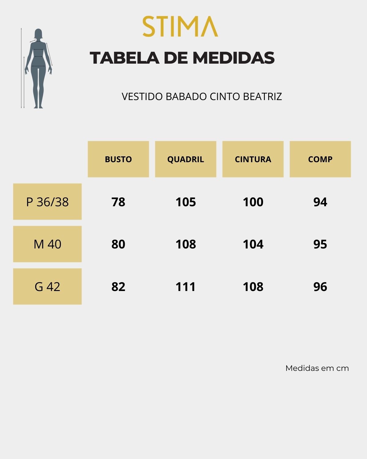 A modelo das fotos veste 36|38, pesa 50kg e tem a altura de 1,55m, ela veste o tamanho P do vestido.